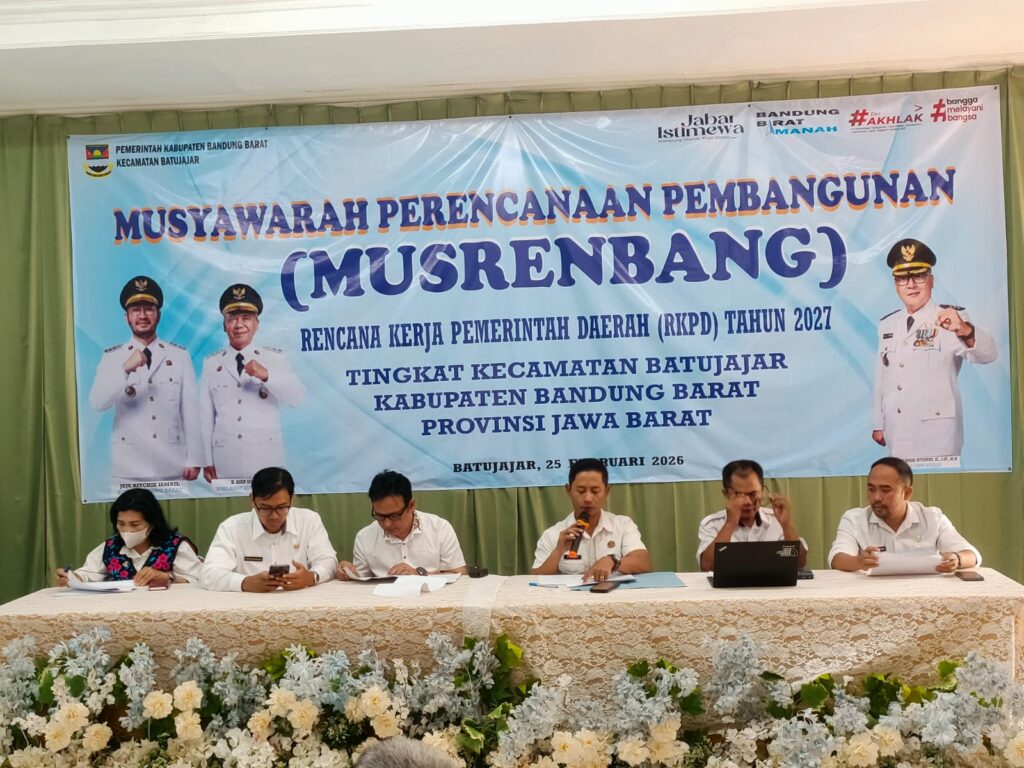 Batujajar, Kabupaten Bandung Barat. 25 Februari 2026. Musyawarah Perencanaan Pembangunan (Musrenbang) RKPD Kabupaten Bandung Barat Tahun 2027 tingkat Kecamatan Batujajar digelar di Aula PEPABRI Batujajar dengan mengusung tema “Penguatan Ekonomi dan Daya Saing Daerah dalam rangka Pemerataan Kesejahteraan Masyarakat”. Forum ini menjadi ruang dialog lintas sektor untuk merumuskan prioritas pembangunan berbasis kebutuhan masyarakat.