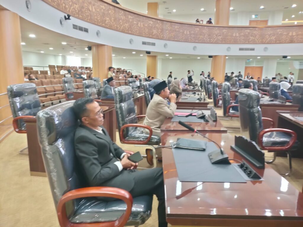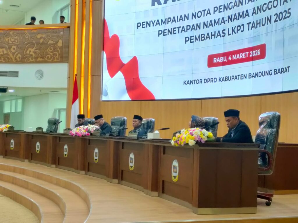 Bandung Barat, 4 Maret 2026 Dewan Perwakilan Rakyat Daerah Kabupaten Bandung Barat menggelar Rapat Paripurna dengan agenda penyampaian Nota Pengantar Laporan Keterangan Pertanggungjawaban (LKPJ) Bupati Tahun Anggaran 2025 sekaligus penetapan nama-nama anggota Panitia Khusus (Pansus) pembahas LKPJ, Rabu (4/3/2026), di Kantor DPRD Kabupaten Bandung Barat.