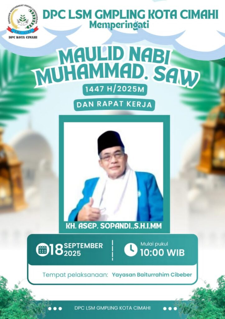 Cimahi, Jawa Barat – 18 September 2025. Dalam suasana penuh khidmat dan kehangatan keagamaan, Dewan Pengurus Cabang (DPC) Lembaga Swadaya Masyarakat Gerakan Masyarakat Peduli Lingkungan (GMPLING) Kota Cimahi menggelar acara bersama memeringati Maulid Nabi Muhammad SAW 1447 H / 2025 M, disertai dengan rapat kerja organisasi. Acara digelar pada Kamis, 18 September 2025, mulai pukul 10.00 WIB di Yayasan Baiturrahim Cibeber. Tausiyah disampaikan oleh KH. Asep Sopandi, S.H.I., M.M., dan dipandu oleh Sekretaris DPC, Rully Hamidah.